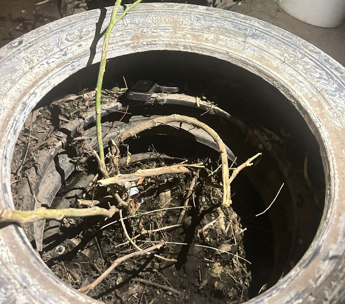 Al arribar al lugar, los efectivos constataron la presencia de tres jóvenes ingiriendo bebidas alcohólicas en inmediaciones de una escalera del complejo. Durante la inspección del área, se halló una pistola oculta dentro de una rueda utilizada como cantero.